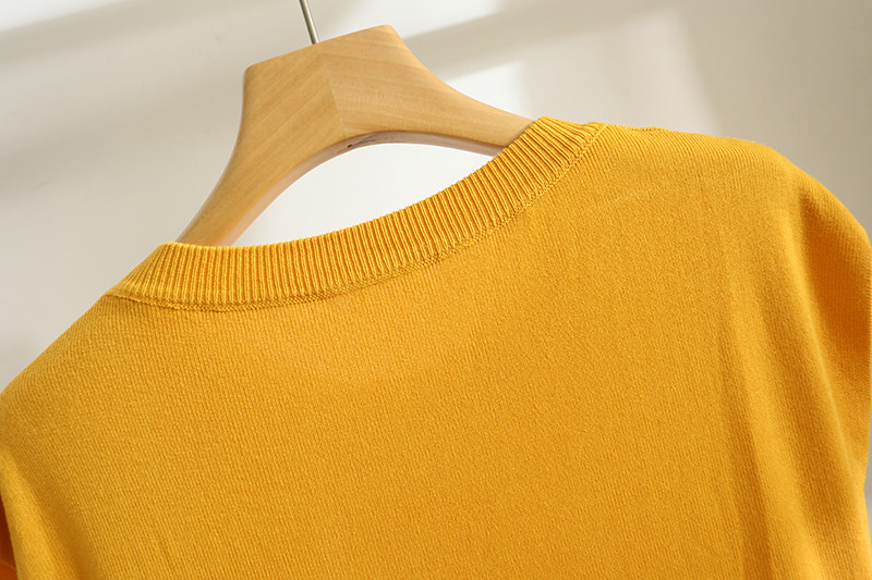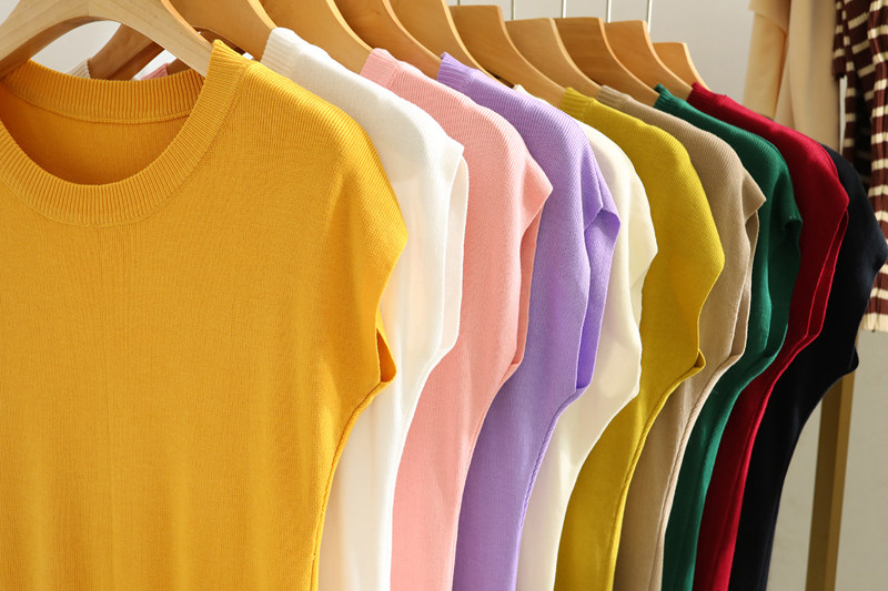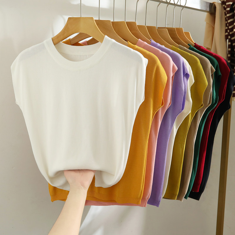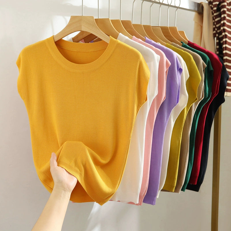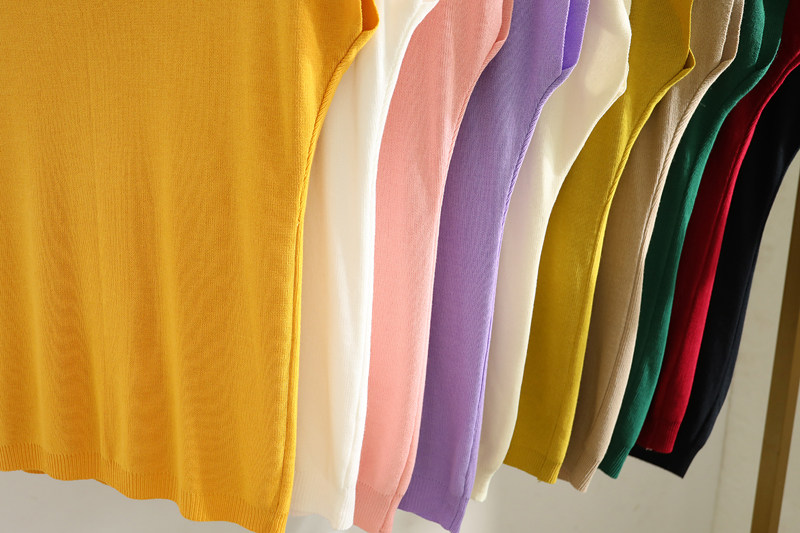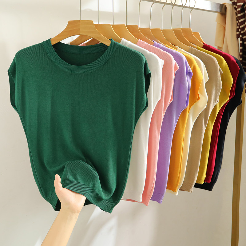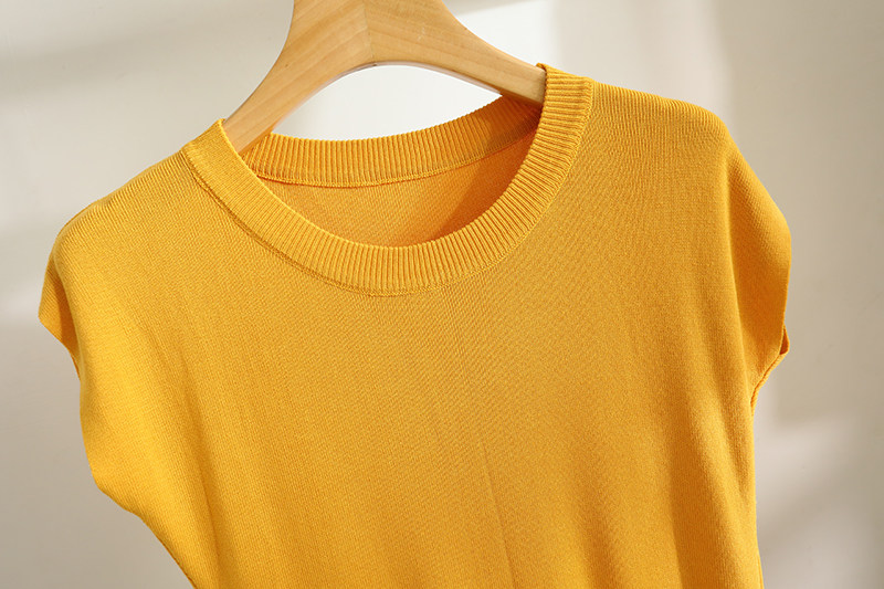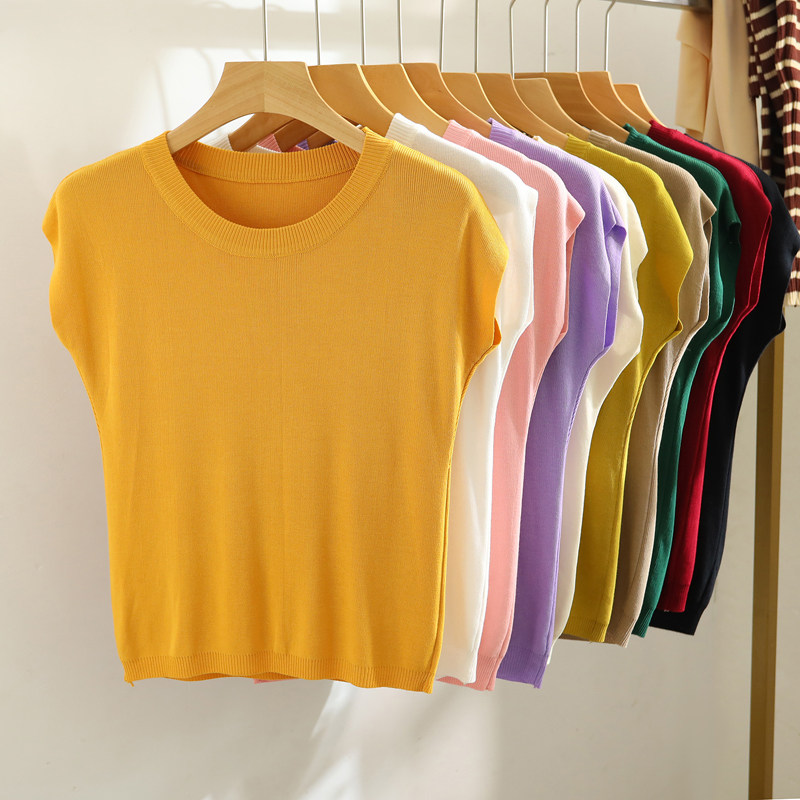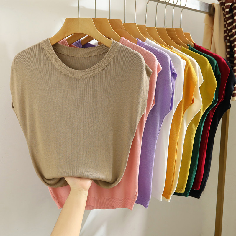 Malhas de manga curta com ombro caído e cor sólida fina de seda gelada